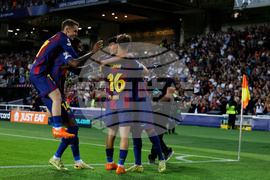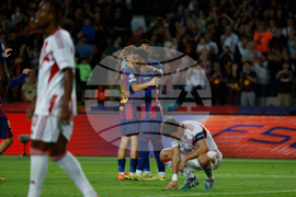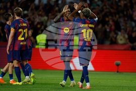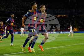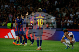 Barcelona's players celebrate the second goal of their team during the Champions League opening phase soccer match between Barcelona and Olympiacos in Barcelona, Spain, Tuesday, Oct. 21, 2025. (AP Photo/Joan Monfort)