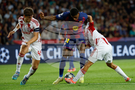 Barcelona's Alejandro Balde, center, controls the ball Olympiacos' Santiago Hezze holds him during the Champions League opening phase soccer match between Barcelona and Olympiacos in Barcelona, Spain, Tuesday, Oct. 21, 2025. (AP Photo/Joan Monfort)
