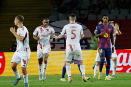 Olympiacos players react after the Champions League opening phase soccer match between Barcelona and Olympiacos in Barcelona, Spain, Tuesday, Oct. 21, 2025. (AP Photo/Joan Monfort)