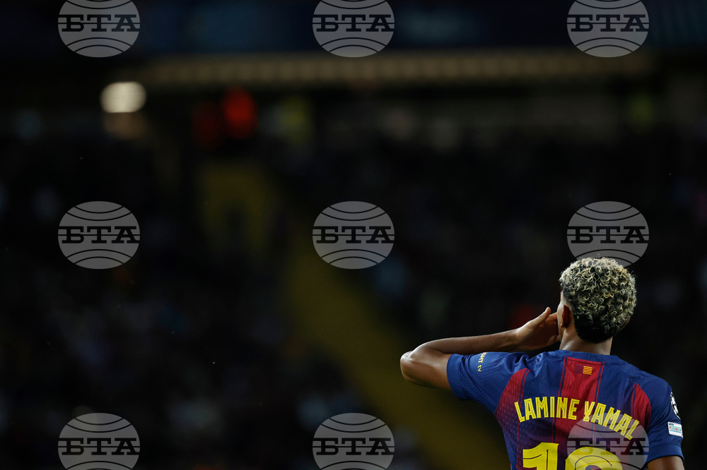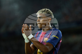 Barcelona's Lamine Yamal applauds during the Champions League opening phase soccer match between Barcelona and Olympiacos in Barcelona, Spain, Tuesday, Oct. 21, 2025. (AP Photo/Joan Monfort)