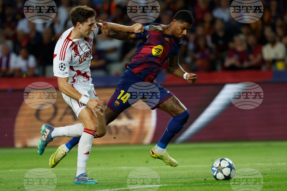 Olympiacos' Panagiotis Retsos, left, holds Barcelona's Marcus Rashford during the Champions League opening phase soccer match between Barcelona and Olympiacos in Barcelona, Spain, Tuesday, Oct. 21, 2025. (AP Photo/Joan Monfort)