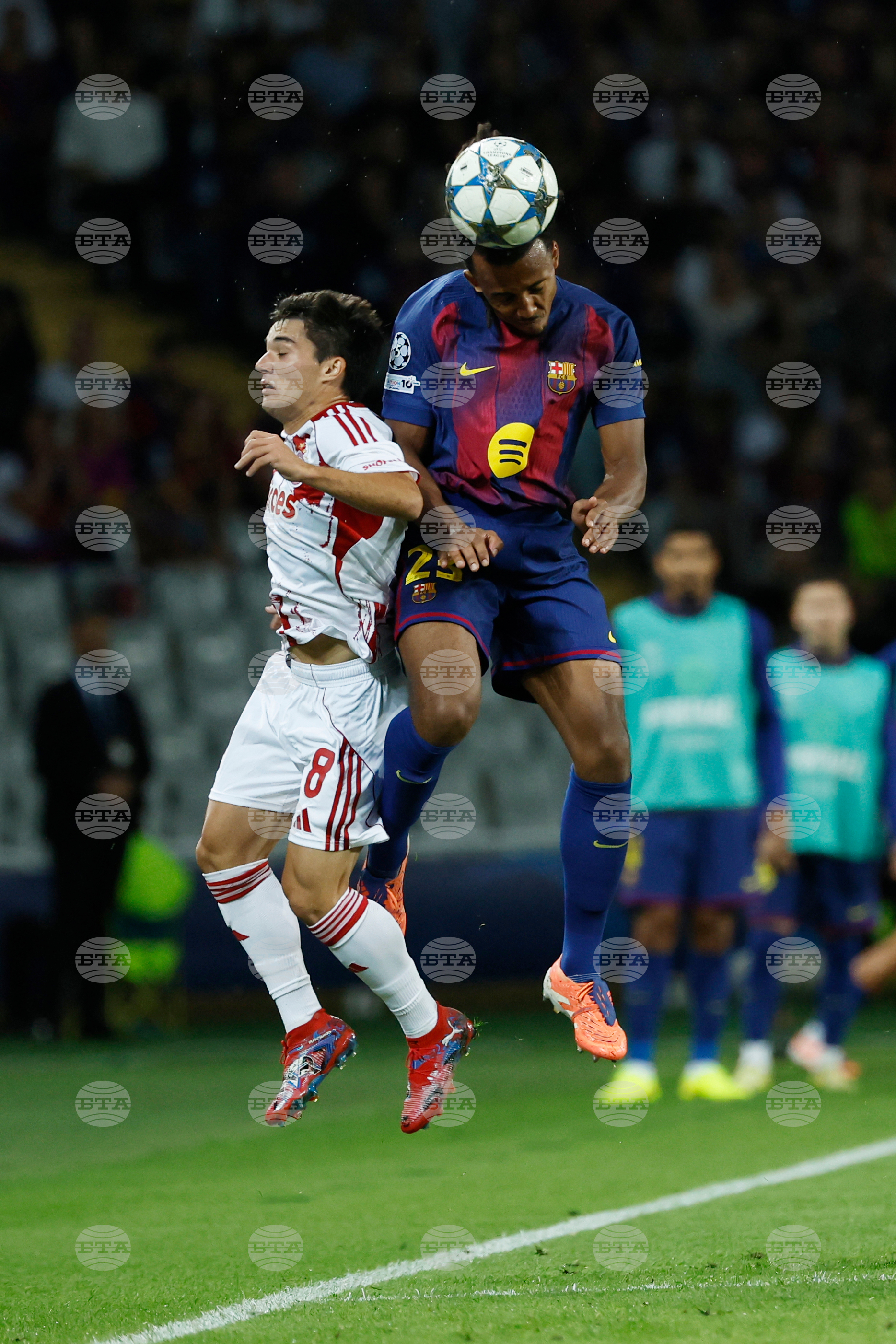 Olympiacos' Diogo Nascimento, left, and Barcelona's Jules Kounde jump for the ball during the Champions League opening phase soccer match between Barcelona and Olympiacos in Barcelona, Spain, Tuesday, Oct. 21, 2025. (AP Photo/Joan Monfort)