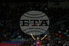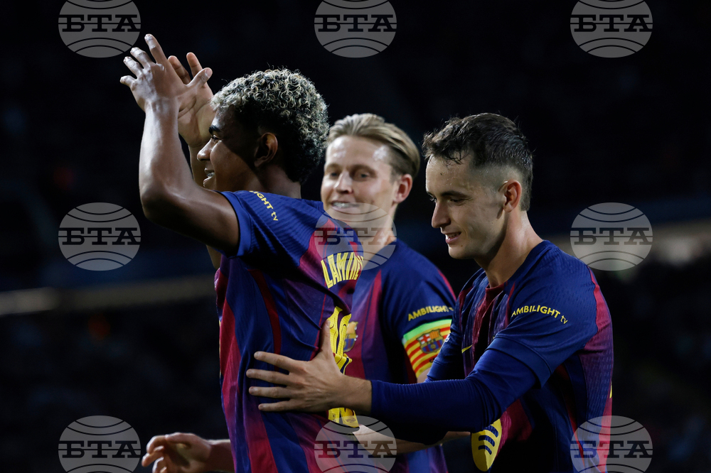 Barcelona's players celebrate the sixth goal of their team during the Champions League opening phase soccer match between Barcelona and Olympiacos in Barcelona, Spain, Tuesday, Oct. 21, 2025. (AP Photo/Joan Monfort)
