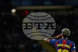 Nicki Nicole, left, girlfriend of Barcelona's Lamine Yamal, right, waits for the start of the Champions League opening phase soccer match between Barcelona and Olympiacos in Barcelona, Spain, Tuesday, Oct. 21, 2025. (AP Photo/Joan Monfort)