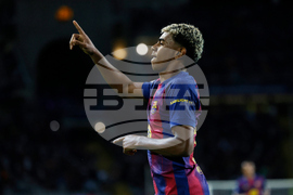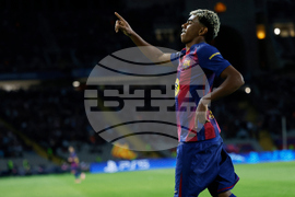 Barcelona's Lamine Yamal celebrates after scoring his side's third goal during the Champions League opening phase soccer match between Barcelona and Olympiacos in Barcelona, Spain, Tuesday, Oct. 21, 2025. (AP Photo/Joan Monfort)