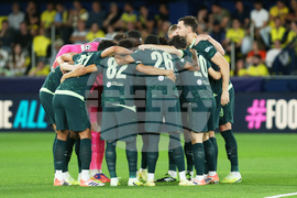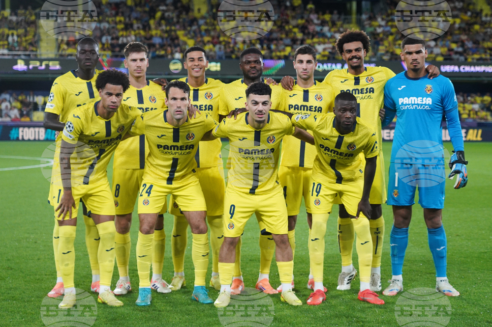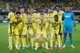 Villarreal starting players pose for a team photo at the beginning of the Champions League opening phase soccer match between Villarreal and Manchester City in Villarreal, Spain, Tuesday, Oct. 21, 2025. (AP Photo/Alberto Saiz)