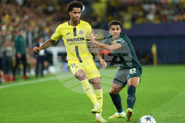 Villarreal's Santiago Mourino, left, challenges for the ball with Manchester City's Tijjani Reijnders during the Champions League opening phase soccer match between Villarreal and Manchester City in Villarreal, Spain, Tuesday, Oct. 21, 2025. (AP Photo/Alberto Saiz)