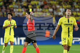 Referee Serdar Gozubuyuk shows a yellow card to Villarreal's Alfonso Pedraza, left, during the Champions League opening phase soccer match between Villarreal and Manchester City in Villarreal, Spain, Tuesday, Oct. 21, 2025. (AP Photo/Alberto Saiz)