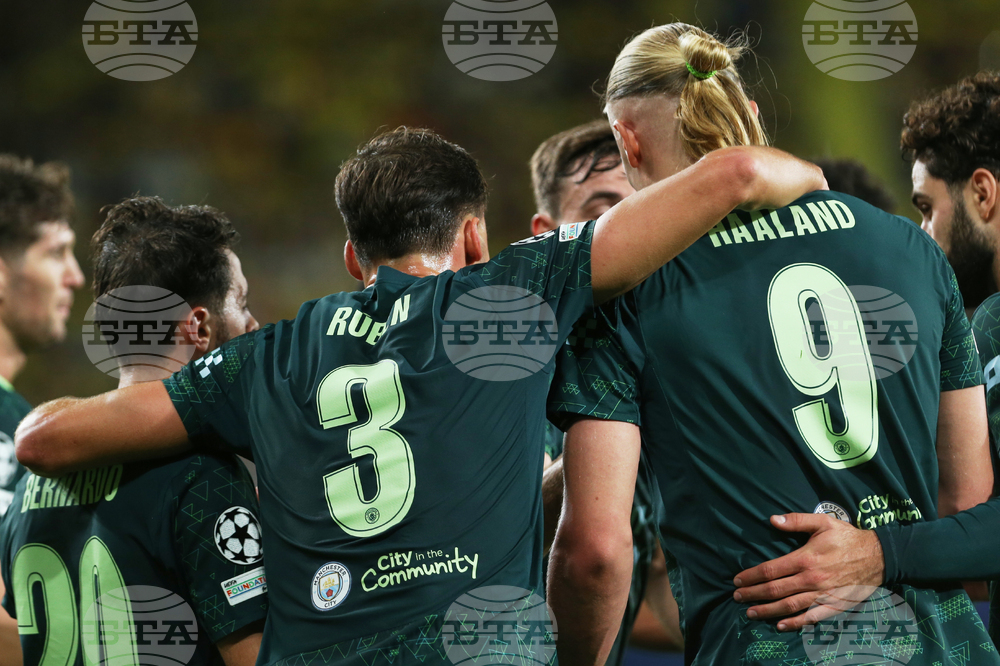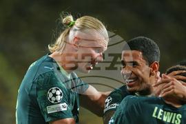 Manchester City's Erling Haaland, right, celebrates with teammates after scoring his side's opening goal during the Champions League opening phase soccer match between Villarreal and Manchester City in Villarreal, Spain, Tuesday, Oct. 21, 2025. (AP Photo/Alberto Saiz)