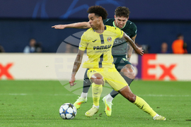 Villarreal's Tajon Buchanan, left, challenges for the ball with Manchester City's Rico Lewis during the Champions League opening phase soccer match between Villarreal and Manchester City in Villarreal, Spain, Tuesday, Oct. 21, 2025. (AP Photo/Alberto Saiz)