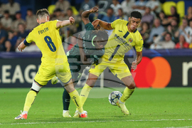 Villarreal's Sergi Cardona, left, challenges for the ball with Manchester City's Savinho, centre, during the Champions League opening phase soccer match between Villarreal and Manchester City in Villarreal, Spain, Tuesday, Oct. 21, 2025. (AP Photo/Alberto Saiz)