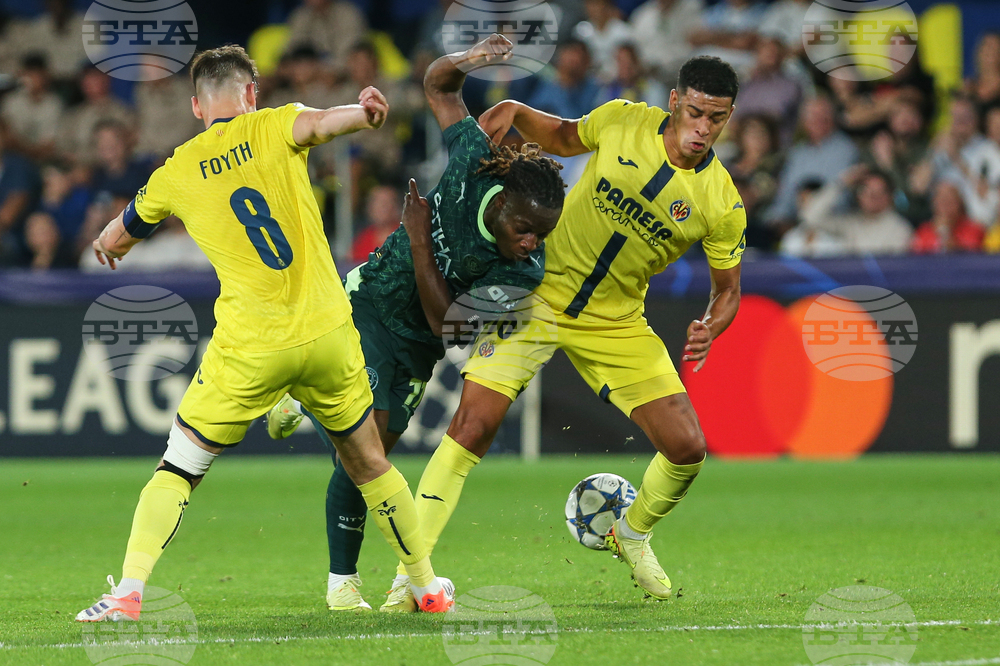 Manchester City's Savinho, centre, makes an attempt to score during the Champions League opening phase soccer match between Villarreal and Manchester City in Villarreal, Spain, Tuesday, Oct. 21, 2025. (AP Photo/Alberto Saiz)