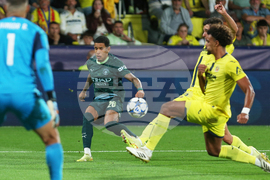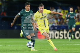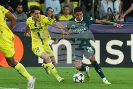 Villarreal's Sergi Cardona, left, challenges for the ball with Manchester City's Savinho during the Champions League opening phase soccer match between Villarreal and Manchester City in Villarreal, Spain, Tuesday, Oct. 21, 2025. (AP Photo/Alberto Saiz)