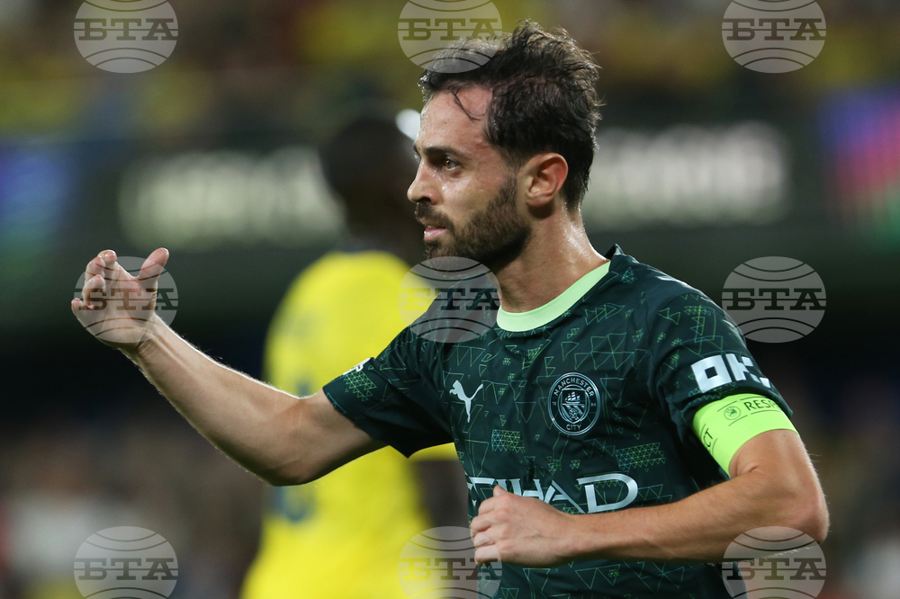 Manchester City's Bernardo Silva celebrates after scoring his side's second goal during the Champions League opening phase soccer match between Villarreal and Manchester City in Villarreal, Spain, Tuesday, Oct. 21, 2025. (AP Photo/Alberto Saiz)