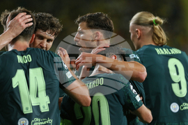 Manchester City players celebrate after Manchester City's Bernardo Silva, centre, scored his side's second goal during the Champions League opening phase soccer match between Villarreal and Manchester City in Villarreal, Spain, Tuesday, Oct. 21, 2025. (AP Photo/Alberto Saiz)