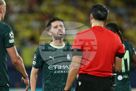 Manchester City's Bernardo Silva argues with referee Serdar Gozubuyuk during the Champions League opening phase soccer match between Villarreal and Manchester City in Villarreal, Spain, Tuesday, Oct. 21, 2025. (AP Photo/Alberto Saiz)