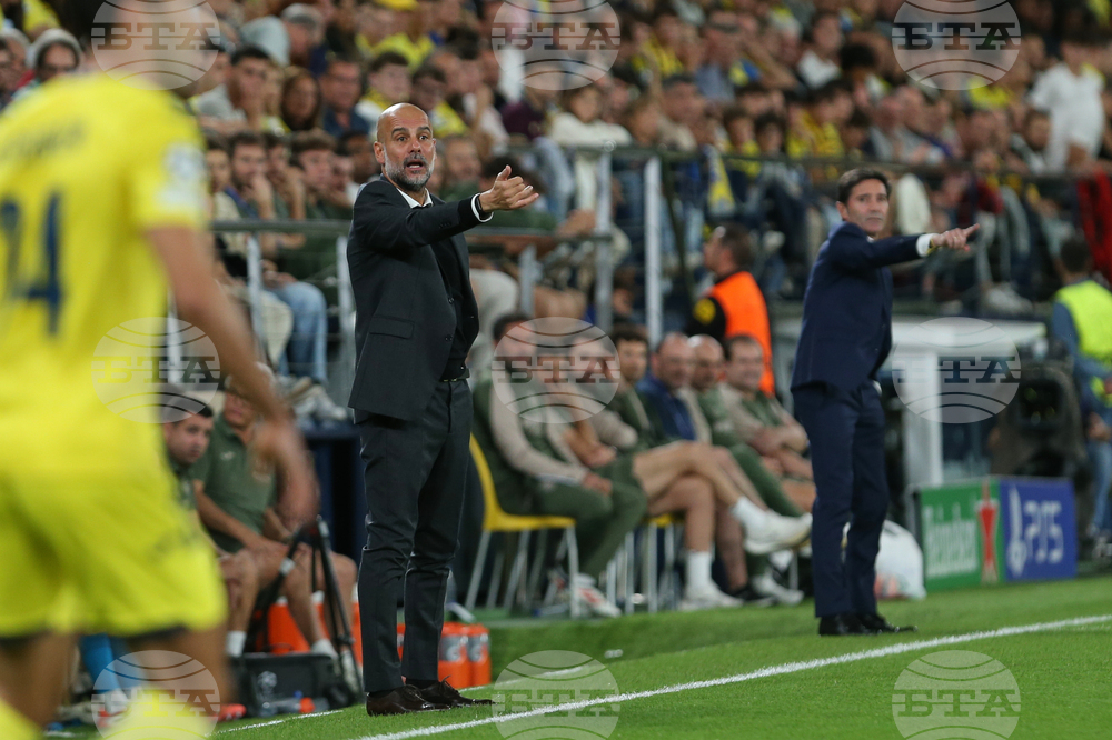 Manchester City's head coach Pep Guardiola and Villarreal's manager Marcelino, right, give instructions from the side line during the Champions League opening phase soccer match between Villarreal and Manchester City in Villarreal, Spain, Tuesday, Oct. 21, 2025. (AP Photo/Alberto Saiz)