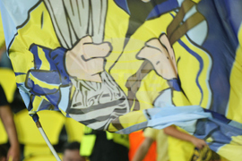 Villarreal fan cheers prior to the Champions League opening phase soccer match between Villarreal and Manchester City in Villarreal, Spain, Tuesday, Oct. 21, 2025. (AP Photo/Alberto Saiz)