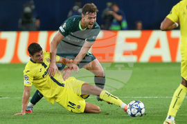 Villarreal's Santi Comesana, bottom left, challenges for the ball with Manchester City's Nico Gonzalez during the Champions League opening phase soccer match between Villarreal and Manchester City in Villarreal, Spain, Tuesday, Oct. 21, 2025. (AP Photo/Alberto Saiz)