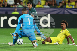 Manchester City's Savinho, centre, makes an attempt to score past Villarreal's goalkeeper Luiz Junior during the Champions League opening phase soccer match between Villarreal and Manchester City in Villarreal, Spain, Tuesday, Oct. 21, 2025. (AP Photo/Alberto Saiz)