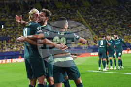 Manchester City players celebrate after Manchester City's Bernardo Silva scored his side's second goal during the Champions League opening phase soccer match between Villarreal and Manchester City in Villarreal, Spain, Tuesday, Oct. 21, 2025. (AP Photo/Alberto Saiz)