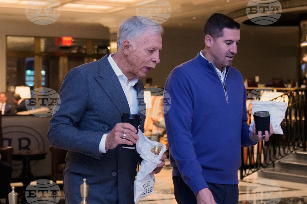 Los Angeles Rams owner Stanley Kroenk, left, arrives for NFL owners meetings, in New York, Wednesday, Oct. 22, 2025. (AP Photo/Richard Drew)