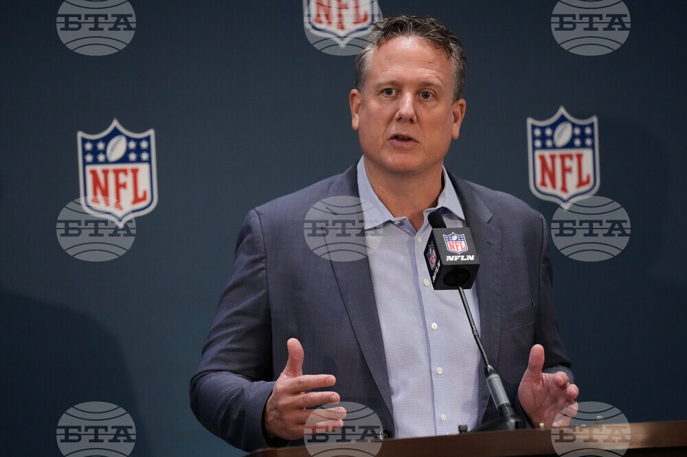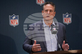 Hans Schroeder, NFL Executive Vice President of Media Distribution, speaks at a news conference during the NFL owners meetings, in New York, Wednesday, Oct. 22, 2025. (AP Photo/Richard Drew)
