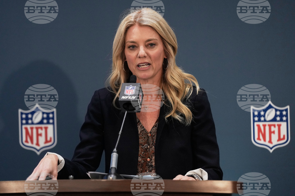 NFL Executive Vice President & Chief Revenue Officer Renie Anderson speaks at a news conference during the NFL owners meetings, in New York, Wednesday, Oct. 22, 2025. (AP Photo/Richard Drew)