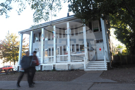 People walk by the Alpha Sigma Phi fraternity house, Friday, Oct. 17, 2025, in New Brunswick, N.J. (Patti Sapone/NJ Advance Media via AP)