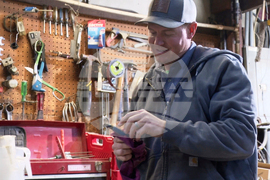 FILE - Bryant Kagay holds a tool in the workshop of the farm he co-owns with his father and grandfather in Amity, Missouri, April 4, 2025. (AP Photo/Nick Ingram, File)