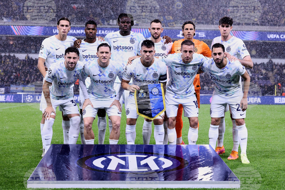 Inter Milan players pose for a group photo prior to the Champions League opening phase soccer match between Union St. Gilloise and Inter Milan in Brussels, Tuesday, Oct. 21, 2025. (AP Photo/Omar Havana)