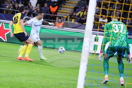 Inter Milan's Francesco Pio Esposito, center, scores his sides fourth goal during the Champions League opening phase soccer match between Union St. Gilloise and Inter Milan in Brussels, Tuesday, Oct. 21, 2025. (AP Photo/Omar Havana)
