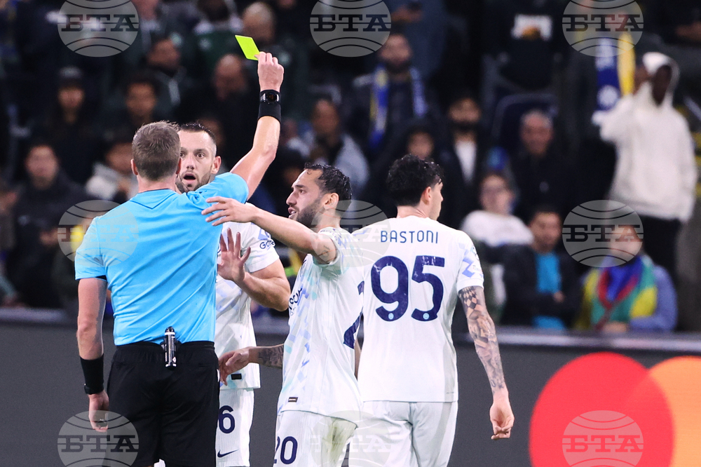 Inter Milan's Stefan de Vrij, second left, receives a yellow card during the Champions League opening phase soccer match between Union St. Gilloise and Inter Milan in Brussels, Tuesday, Oct. 21, 2025. (AP Photo/Omar Havana)