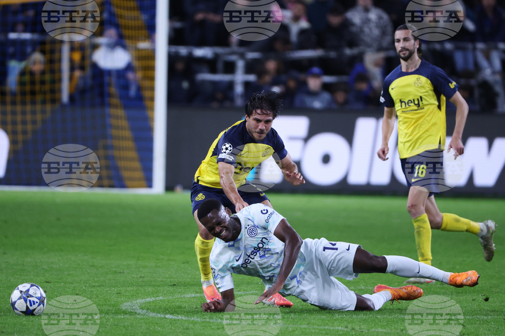 Inter Milan's Ange-Yoan Bonny, center, falls as he fights for the ball with Union SG's Kevin Mac Allister, left, during the Champions League opening phase soccer match between Union St. Gilloise and Inter Milan in Brussels, Tuesday, Oct. 21, 2025. (AP Photo/Omar Havana)