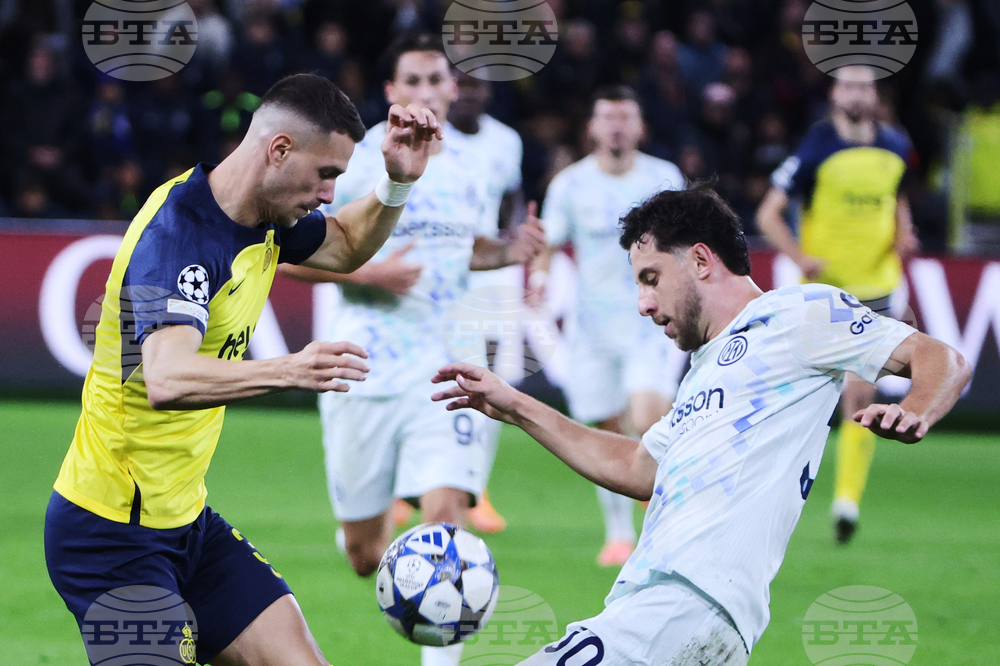 Inter Milan's Stefan de Vrij, second left, fights for the ball with Union SG's Kevin Mac Allister, left, during the Champions League opening phase soccer match between Union St. Gilloise and Inter Milan in Brussels, Tuesday, Oct. 21, 2025. (AP Photo/Omar Havana)