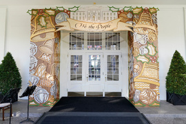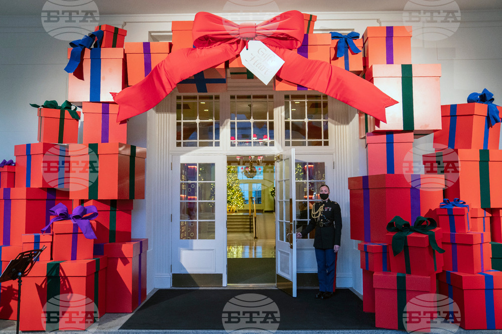 FILE - A Marine White House military social aide holds the door to the East Wing entrance of the White House during a press preview of the White House holiday decorations, Nov. 29, 2021, in Washington. (AP Photo/Evan Vucci, File)