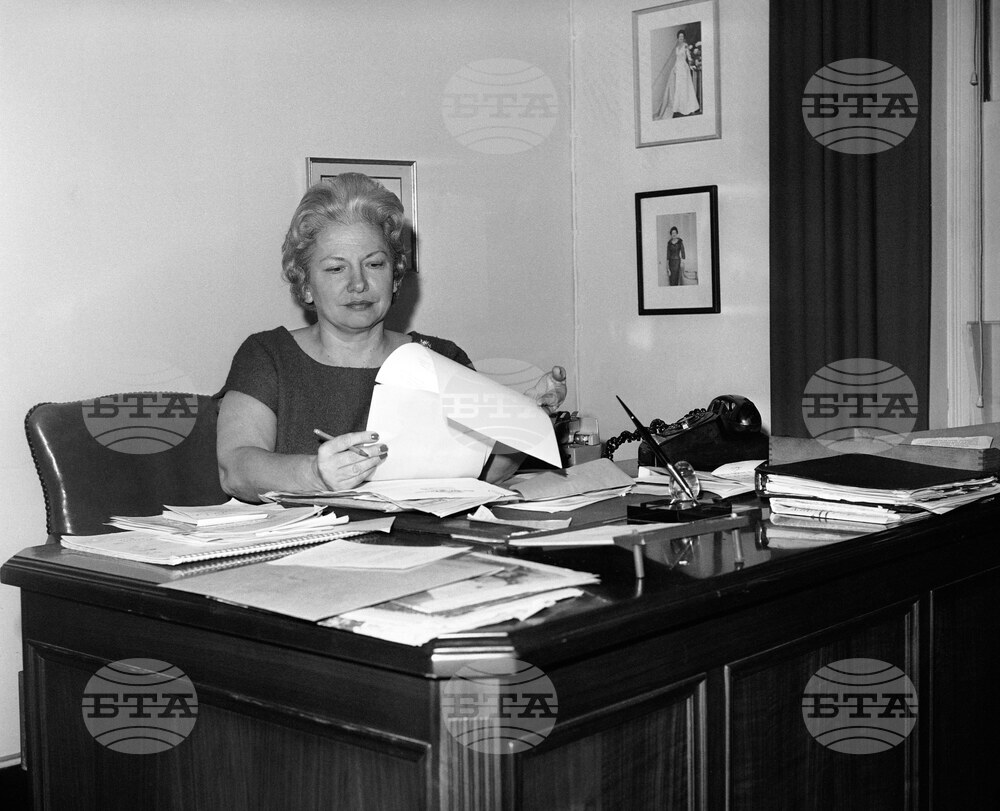 FILE - Liz Carpenter, press secretary and staff director for first lady Lady Bird Johnson, poses for a photo in her office in the East Wing of the White House in Washington, D.C., Dec. 9, 1963. On the walls are her Theta Sigma Phi Headliner Award and two photos of Mrs. Lyndon B. Johnson. (AP Photo/Harvey Georges, File)