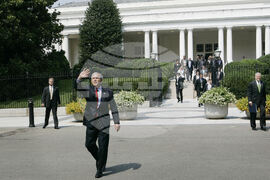 FILE - President Bush waves as walks away from the East Wing of the White House to the neighboring Treasury Building for the swearing-in of Treasury Secretary Henry Paulson, July 10, 2006 in Washington. At right is Chief of Staff Joshua Bolton. (AP Photo/Pablo Martinez Monsivais, File)
