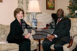 FILE - First lady Laura Bush, left, meets with U.N. Special Adviser on Burma Ibrahim Gambari in her East Wing office of the White House in Washington, Dec. 17, 2007. (AP Photo/Evan Vucci, File)