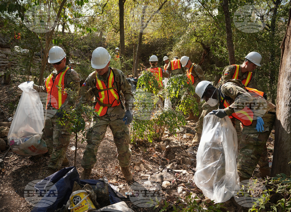 Texas State Guard soldiers remove a homeless camp under an expressway in Austin, Texas, on Tuesday, Oct. 21, 2025. (Jay Tanner/Austin American-Statesman via AP)