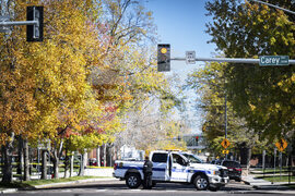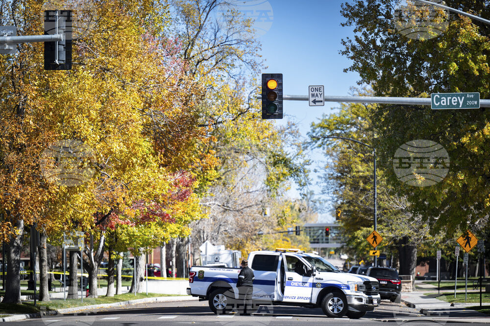 A Cheyenne Police Department community service officer blocks the road in front of the Wyoming Capitol after a suspected improvised explosive device (IED) was found at the state Capitol on Tuesday, Oct. 21, 2025, in Cheyenne, Wyo. (Milo Gladstein/The Wyoming Tribune Eagle via AP)