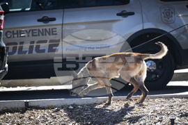 A law enforcement K9 sweeps the grounds of the Wyoming Capitol after a suspected improvised explosive device (IED) was found at the state Capitol on Tuesday, Oct. 21, 2025, in Cheyenne, Wyo. (Milo Gladstein/The Wyoming Tribune Eagle via AP)