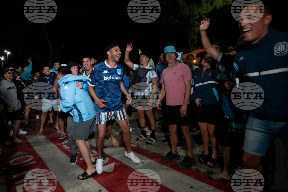 Fans welcome players of Argentina's Racing Club at a hotel ahead a Copa Libertadores semifinal soccer match against Brazil's Flamengo in Rio de Janeiro, Tuesday, Oct. 21, 2025. (AP Photo/Bruna Prado)