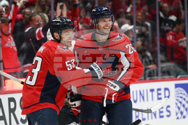 Washington Capitals center Nic Dowd (26) celebrates his goal with center Ethen Frank (53) during the first period of an NHL hockey game against the Seattle Kraken, Tuesday, Oct. 21, 2025, in Washington. (AP Photo/Nick Wass)