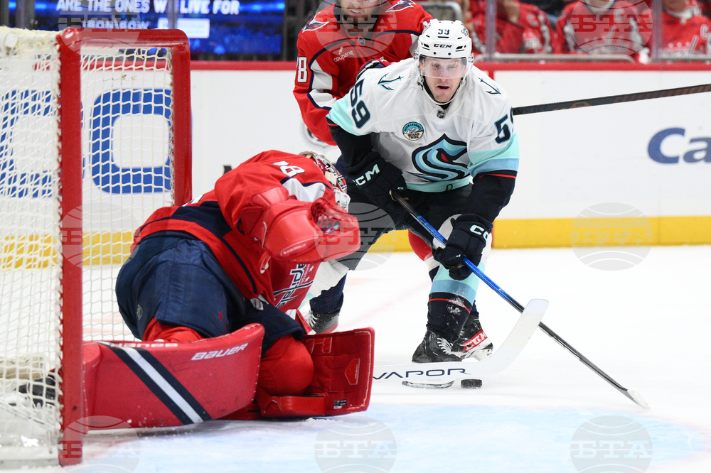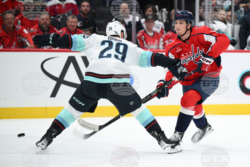 Washington Capitals right wing Ryan Leonard, right, takes a shot against Seattle Kraken defenseman Vince Dunn (29) during the first period of an NHL hockey game, Tuesday, Oct. 21, 2025, in Washington. (AP Photo/Nick Wass)