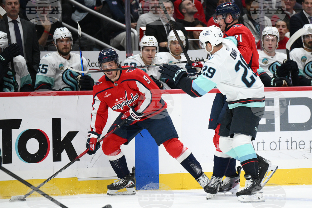 Washington Capitals center Nic Dowd (26) and Seattle Kraken defenseman Ryan Lindgren (55) battle for the puck during the third period of an NHL hockey game, Tuesday, Oct. 21, 2025, in Washington. (AP Photo/Nick Wass)