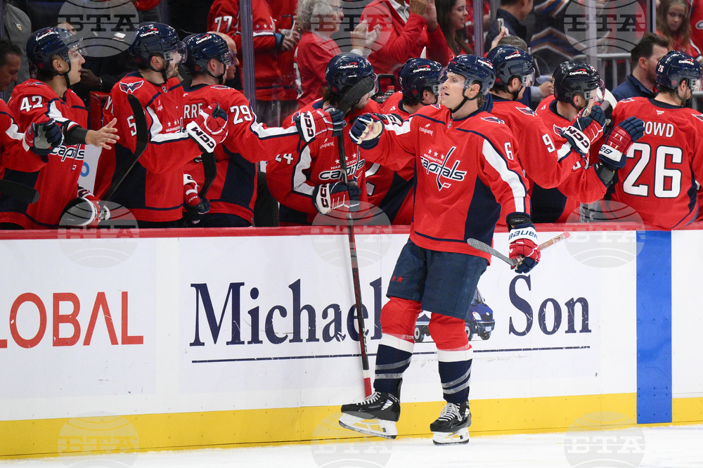 Washington Capitals defenseman Jakob Chychrun (6) celebrates his goal during the second period of an NHL hockey gam against the Seattle Kraken, Tuesday, Oct. 21, 2025, in Washington. (AP Photo/Nick Wass)