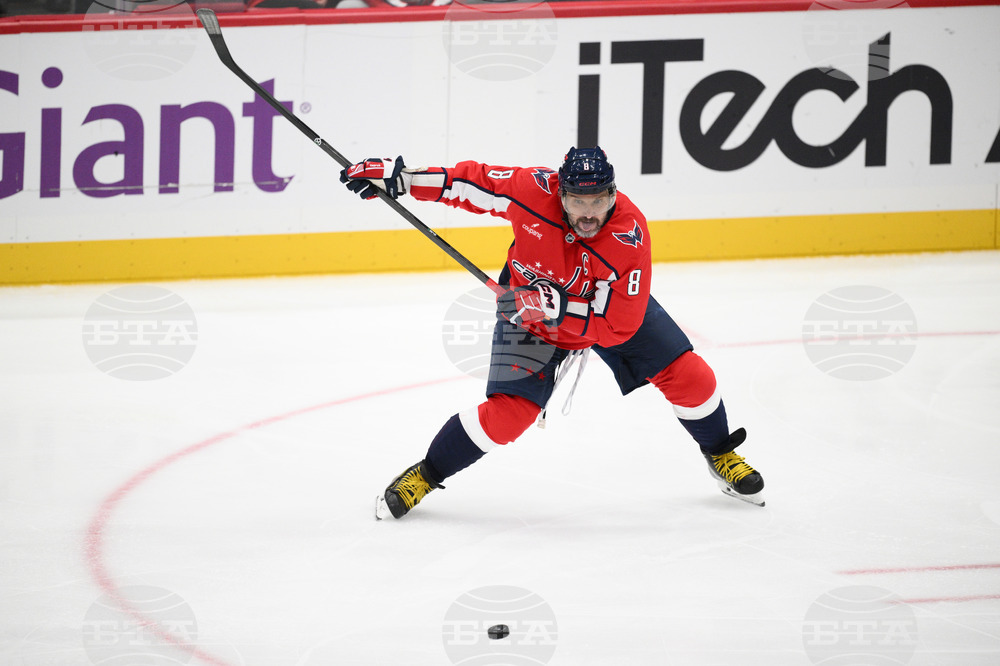 Washington Capitals left wing Alex Ovechkin (8) winds up for a shot during the third period of an NHL hockey game against the Seattle Kraken, Tuesday, Oct. 21, 2025, in Washington. (AP Photo/Nick Wass)