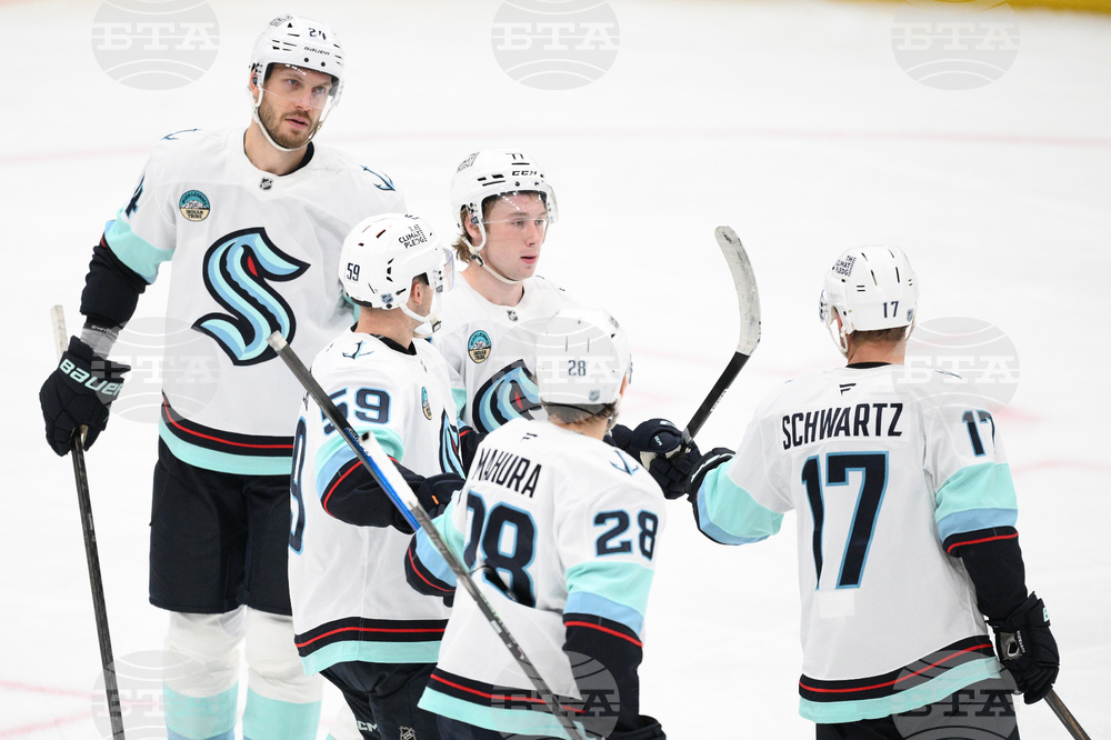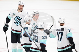 Seattle Kraken left wing Jaden Schwartz (17) celebrates his goal with teammates during the third period of an NHL hockey game against the Washington Capitals, Tuesday, Oct. 21, 2025, in Washington. (AP Photo/Nick Wass)