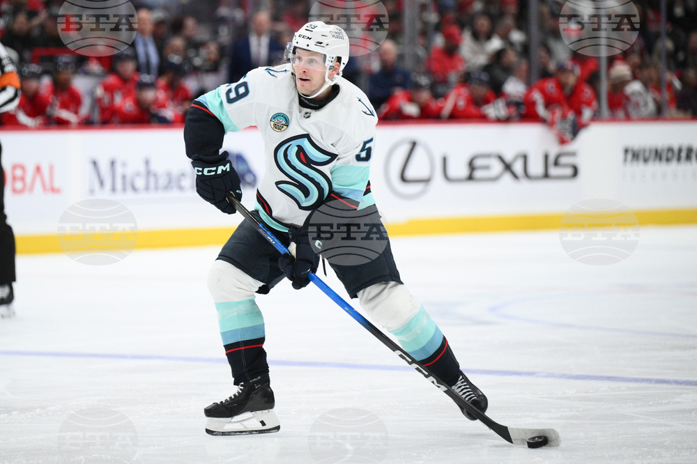 Seattle Kraken center Ben Meyers (59) skates with the puck during the second period of an NHL hockey game against the Washington Capitals, Tuesday, Oct. 21, 2025, in Washington. (AP Photo/Nick Wass)